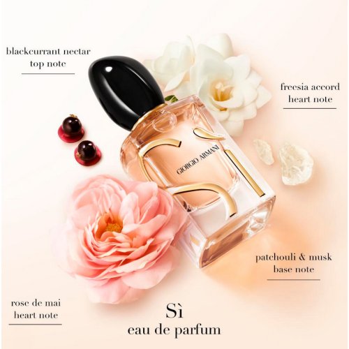 Sì eau de parfum is soft and warm with a hint of sophisticated sweetness. Fresh, green and addictive in its initial impression, the elegance of freesia and the exquisite honey hues of rose de mai absolute make this perfume truly distinctive. The long-lasting and sensual notes of oakmoss and patchouli softly define this fragrance as a captivating modern chypre.