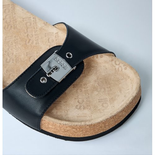 Leather Scholl strap flat sandals with silver-tone hardware.