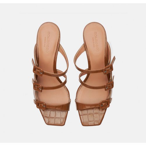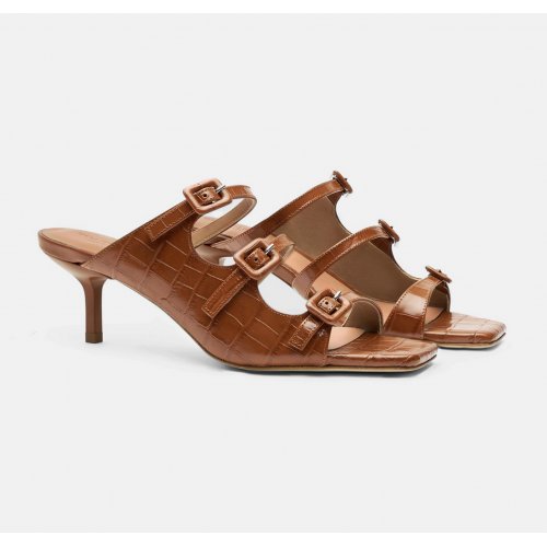 The ‘Manuela’ mule sandals feature a unique design with a square shape and a matte heel. The strappy upper elegantly wraps around the foot, leaving the inner part open to show the natural curve of the foot, while the outer part offers greater coverage. The square buckles covered in the same leather as the upper add a touch of elegance and refinement.